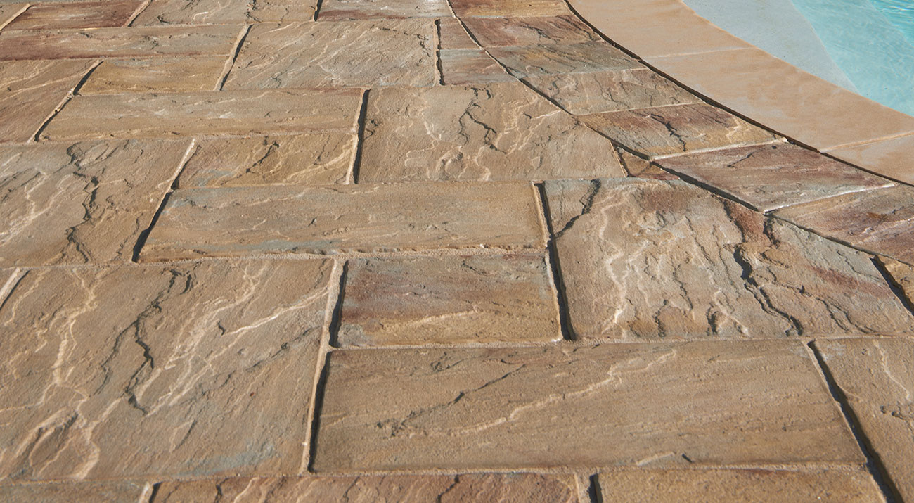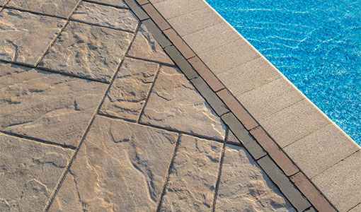 When choosing the right product. one thing that you should consider is surface texture. It’s important to choose a paver that has a safe, non-slip texture to avoid any slips by the pool. Light-toned colors with non-abrasive edges for pool coping (the edge closest to the water) are an added touch that also protect feet from getting too hot. Darker inset borders that help define the pool edge is another feature to consider.